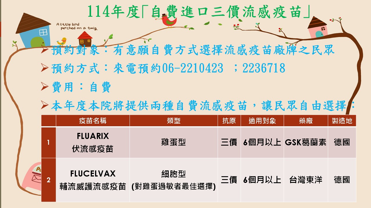 本院114年度自費流感疫苗已到貨 接種流感疫苗是預防流感、降低重症與死亡風險的最有效方法;因每年流行病毒株不同,請務必接種 當年度疫苗以獲得最佳保護。 ★自 114 年度起改採三價流感疫苗。★ 調整依據:世界衛生組織(WHO)建議將多年未檢出的 B 型 Yamagata 病毒株自疫苗成分移除,我國並依 2024 年專家會議決議辦理採購。
